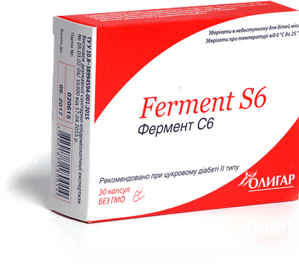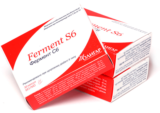 Ferment S6 - унікальний рослинний препарат - новітня розробка українських вчених. Виробництво препарату здійснюється із застосуванням нанотехнологій. Основне призначення препарату це нормалізація рівня цукру у крові при діабеті II типу.